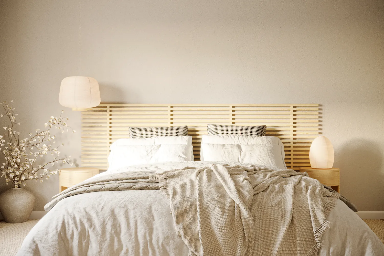 The master bedroom continues the Japandi aesthetic with a focus on tranquility and uncluttered simplicity. Thoughtful furniture placement and textile selection establish a serene retreat that complements the existing architectural elements.
