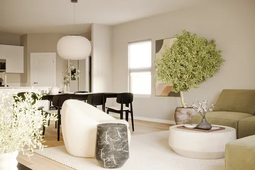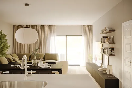 The project centered on two key areas: an open-plan kitchen, dining, and living space, and a master bedroom suite. The design approach prioritized working harmoniously with the developer's original selections rather than against them, transforming builder-grade finishes into a canvas for minimalist elegance.